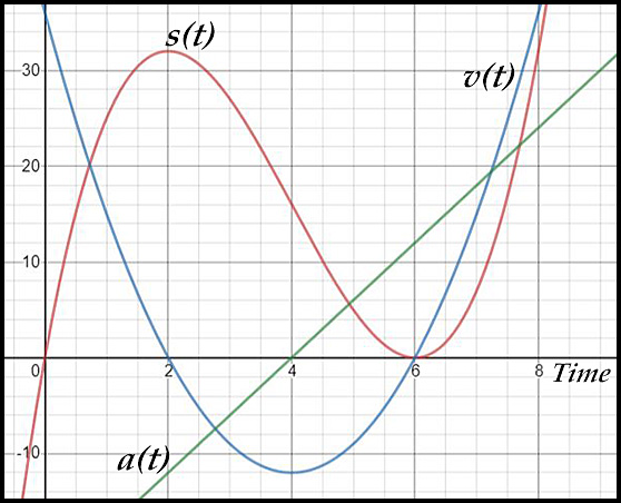 (iv) What is the time interval when the particle is increasing its speed? Speed increases either when vel > 0 and accel > 0 OR when vel < 0 and accel < 0. Here speed > 0 up to t = 2 and then it becomes -ve. Accel is -ve up to t = 4. Up to 2 seconds, speed > 0 and accel < 0 - so no increase. The only interval is therefore 2 < t < 4 because here both speed < 0 and a < 0. Difficult. |