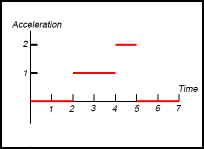 Here the particle continues to accelerate in a positive direction for 4 seconds. Calculating the area of the triangle gives a maximum velocity of 8 m/sec2.