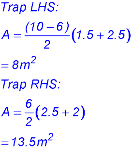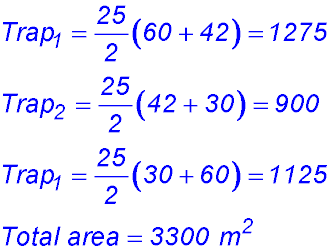Step 3: Sum the four areas: A = 20 + 50 + 55 + 25 = 150 m2. |