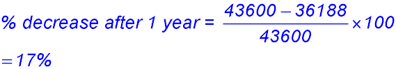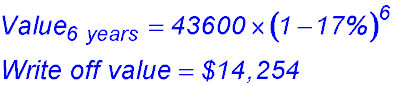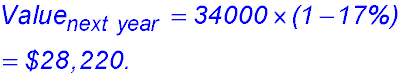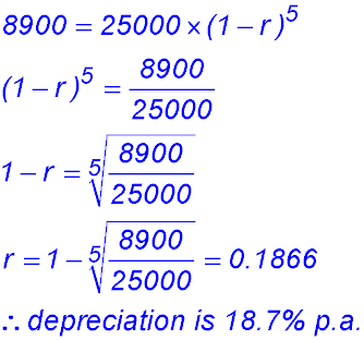 2. Value = $3200 × (1 - 20%)4 = $1,310.72. So value is $1,310 (to the nearest $10) after 4 years? |