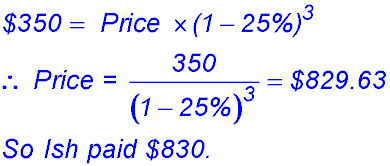 | Future value. | 1. Value = $999×(1 - 25%)3 = $421.45.