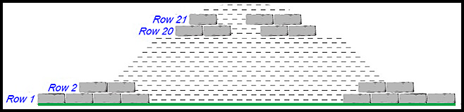 The lowest row (we will call it Row 1) is 180 m long. Each of the rows above the base row Above Row 20, each of the rows have 1 less block than the row below. That pattern continues until the top row which has a total of 10 blocks.