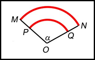 The arc PQ divides the sector MNO into two equal areas - that is the area of PQO = area of MNQP.