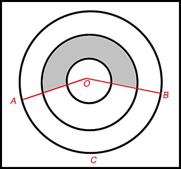 25. A set of three concentric circles with centre O and radii 3.5 cm, 9 cm and 12.5 cm is shown in the diagram below. The length of arc ACB is 22.5 cm.
